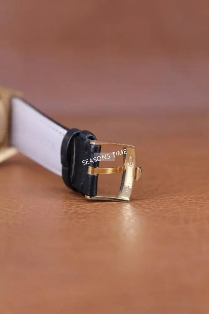Bracelet / Strap: Original Rolex 18k YG Pin Buckle/ Black Leather Strap